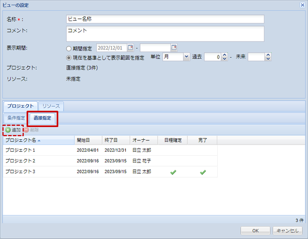 直接指定タブでは、対象プロジェクトを任意に指定することができます。