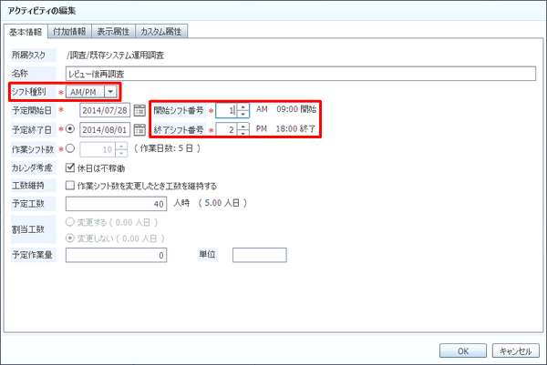 アクティビティの予定期間と、リソース割当の割当工数を、シフト単位にすることができます。