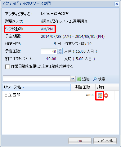 アクティビティのリソース割当の割当工数をシフト単位にする