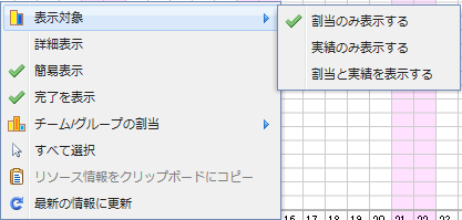リソースグラフに表示しているリソースのスケールごとの能力、割当工数、実績工数をクリップボードにコピーします。 リソース情報をクリップボードにコピーする場合は、以下の手順で操作します。