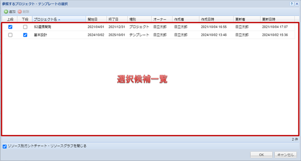 下段ガントチャートに表示する参照プロジェクトまたは参照テンプレートを選択します。 |