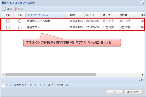 「OK」ボタンをクリックして参照するプロジェクトの選択画面を閉じます。 手順6でチェックを付けたプロジェクトが、自プロジェクトの上段または下段に表示されます。