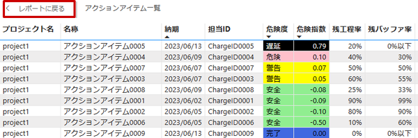 アクションアイテム一覧の行にカーソルを当てた状態で、右クリックして「ドリルスルー」-「危険度履歴」を選択すると、危険度レポートから危険度履歴レポートに遷移します。
